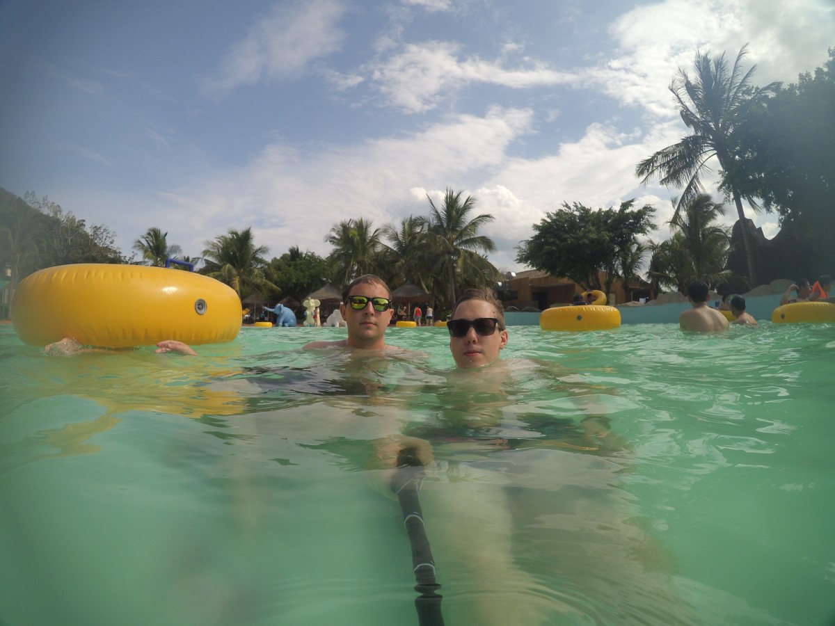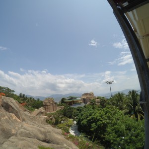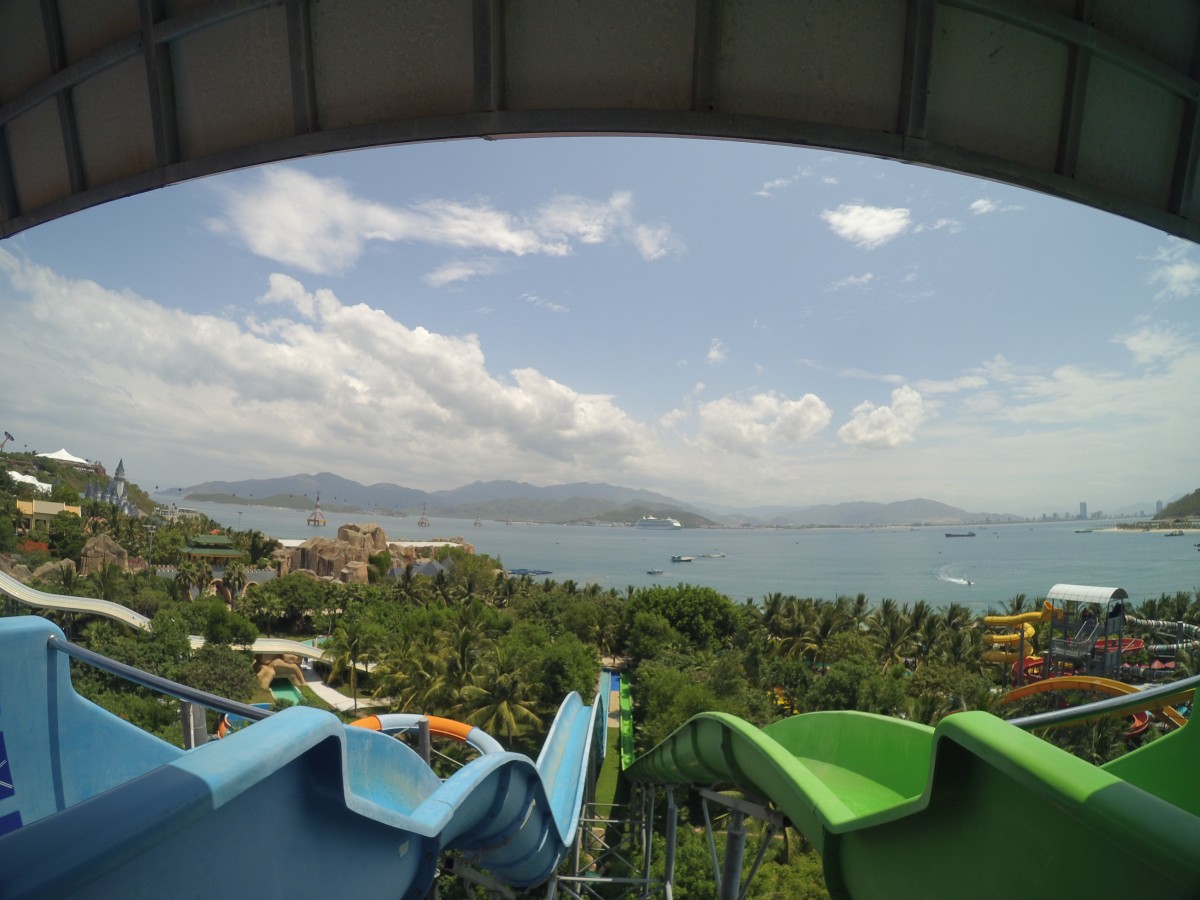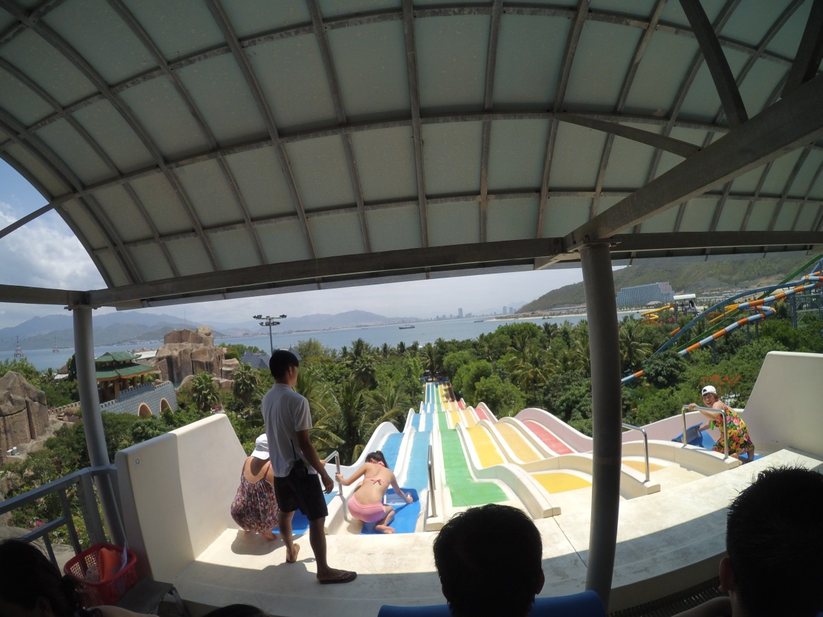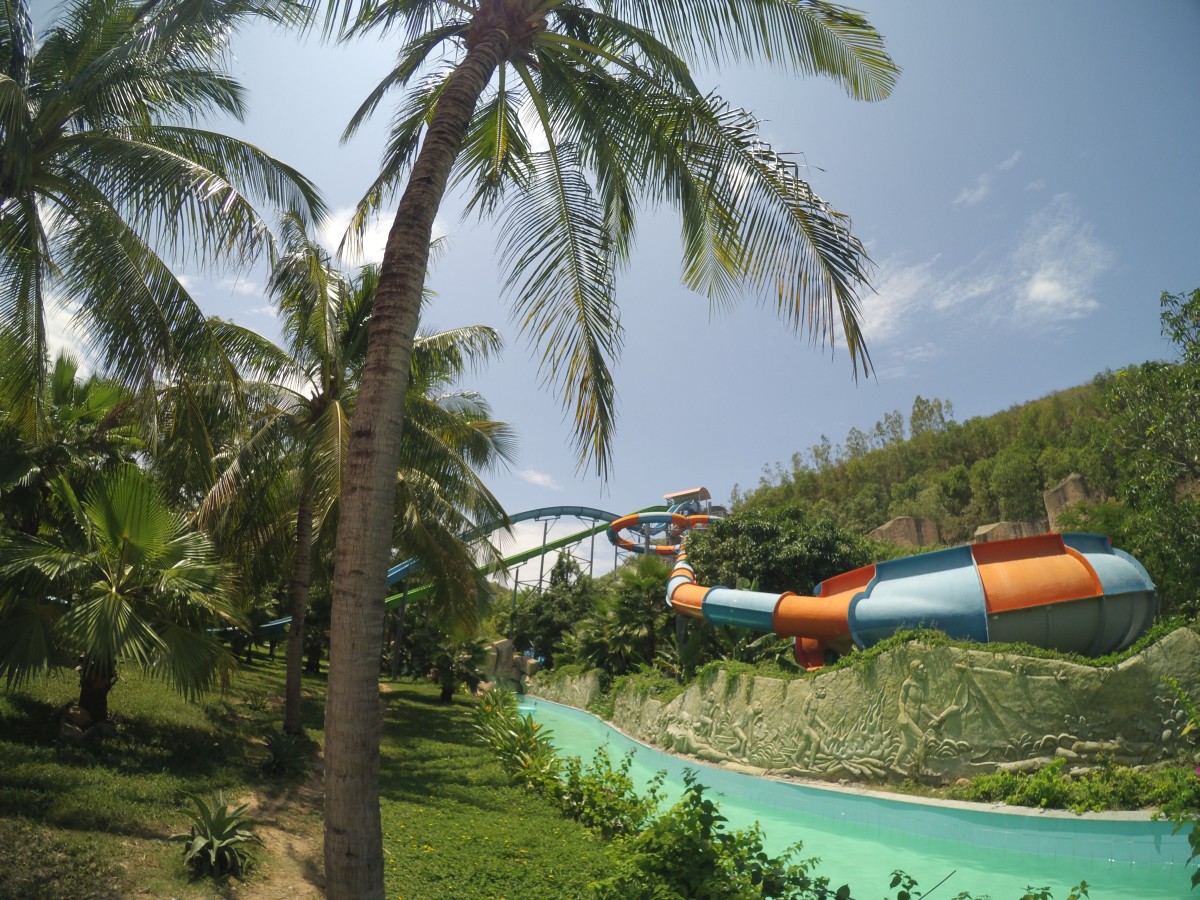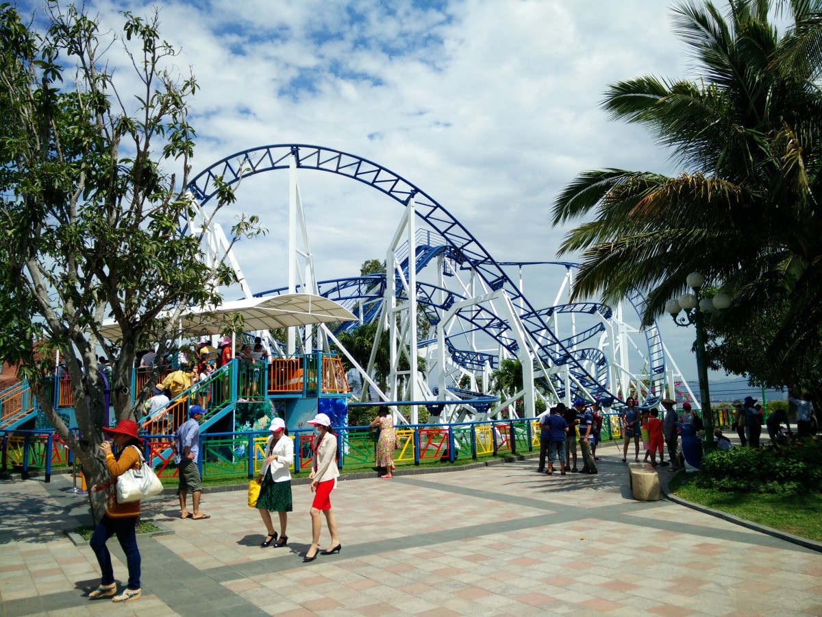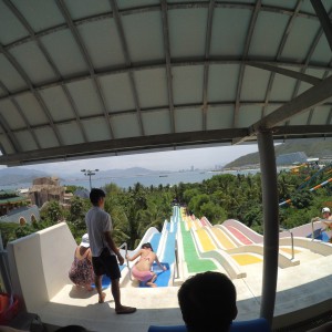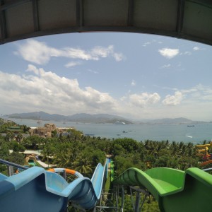 Gestern war der letzte Tag in Hoi An, nach dem wir unsere fertigen Anzüge abgeholt hatten sind wir noch etwas durch die Stadt geschlendert um dann Abends mit dem Nachtbus nach Nha Trang zu fahren. Heute sind wir dann nach einer super holprigen Fahrt gegen 6:30 angekommen, da der Check-in aber erst ab 11:00 im Hostel möglich war haben wir unsere Badehosen eingepackt und sind mit dem Bus zum Vinpearlland Vergnügungspark gefahren der unter anderem einen Wasserpark beinhaltet. Der Eintritt ist für Vietnam mit 20€ relativ hoch dafür sind aber alle Fahrgeschäfte und die Überfahrt mit Fähre/Seilbahn im Preis enthalten. Nach dem Park ging es dann zurück nach Nha Trang, wo uns das erste Mal aufgefallen ist das es von Russen nur so wimmelt. Daher hat auch ein Großteil der Bars und Geschäfte kyrillische Leuchtreklame und Karten ausliegen.