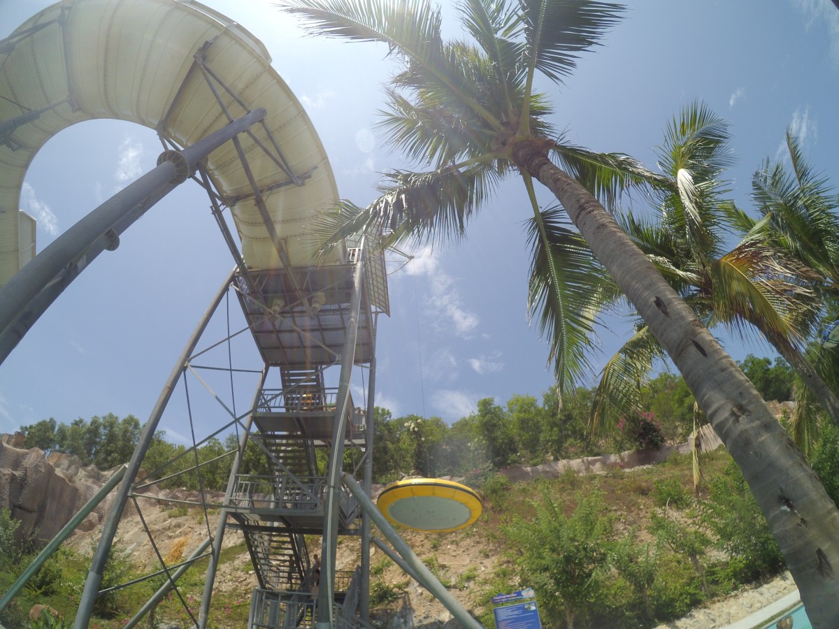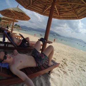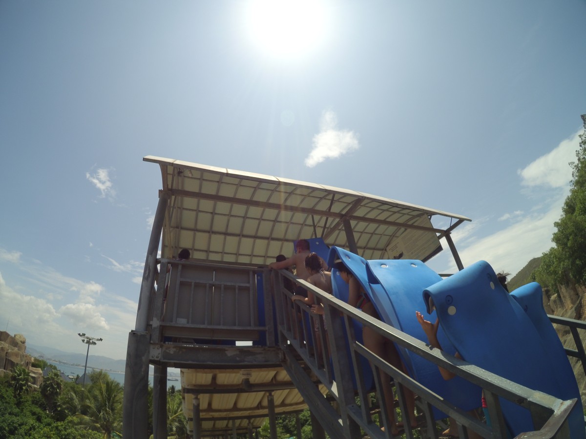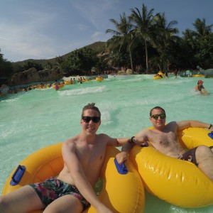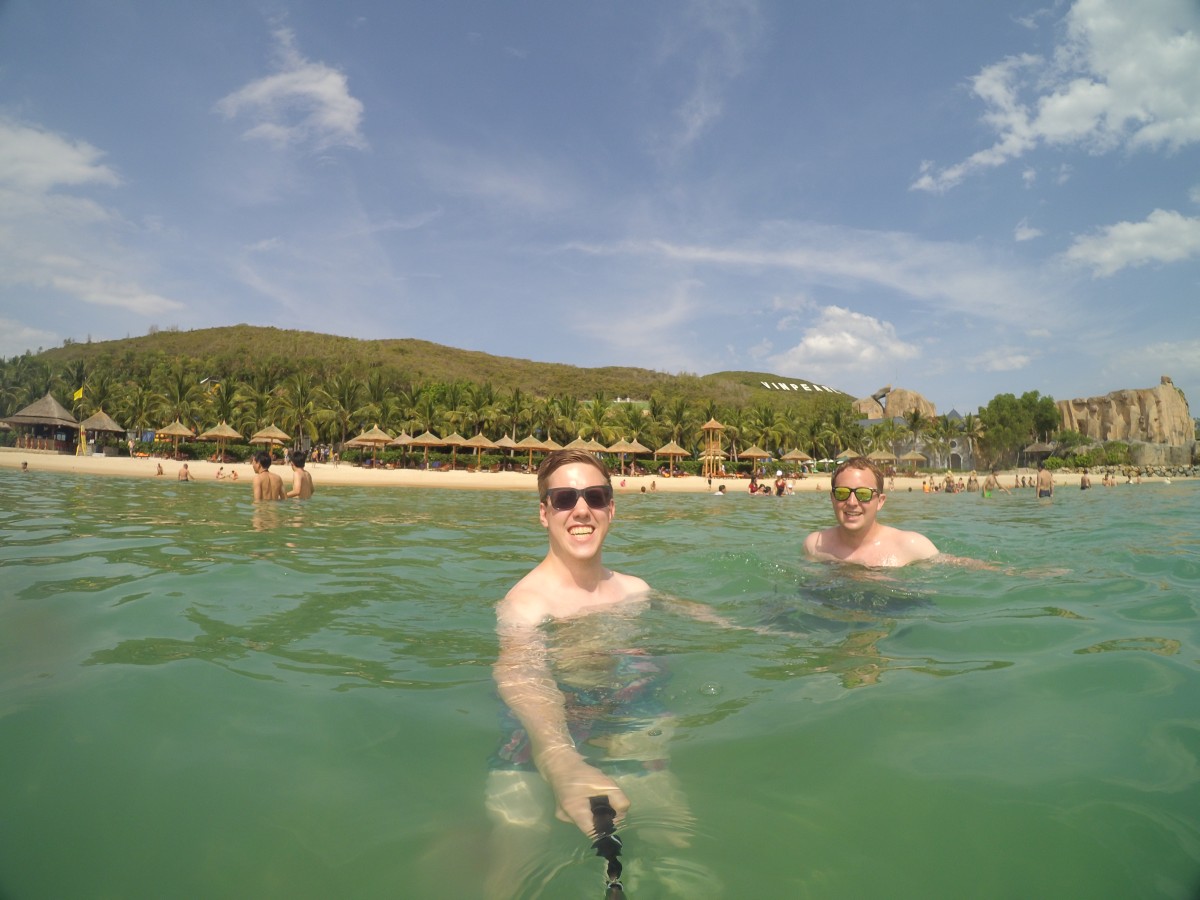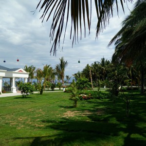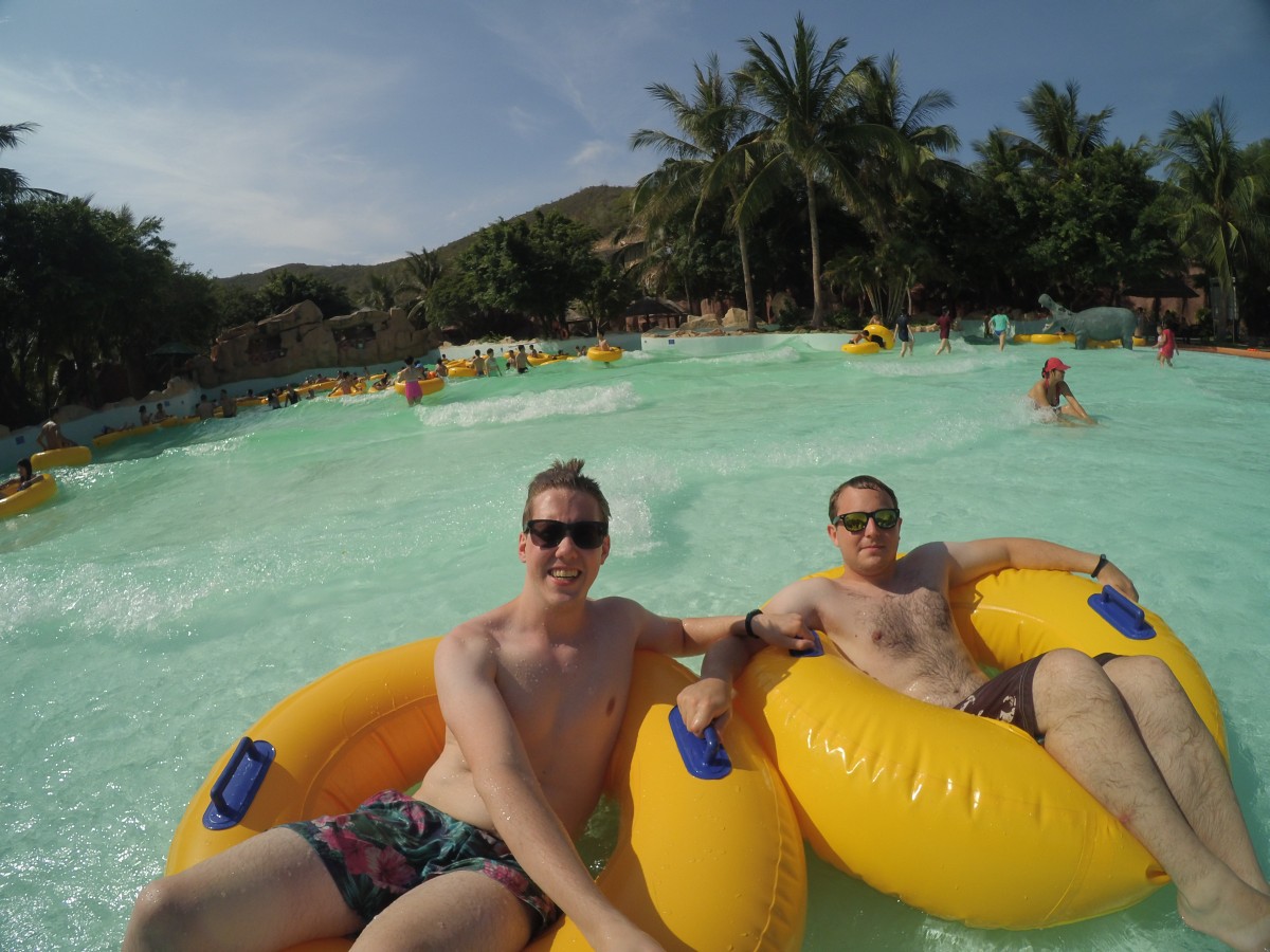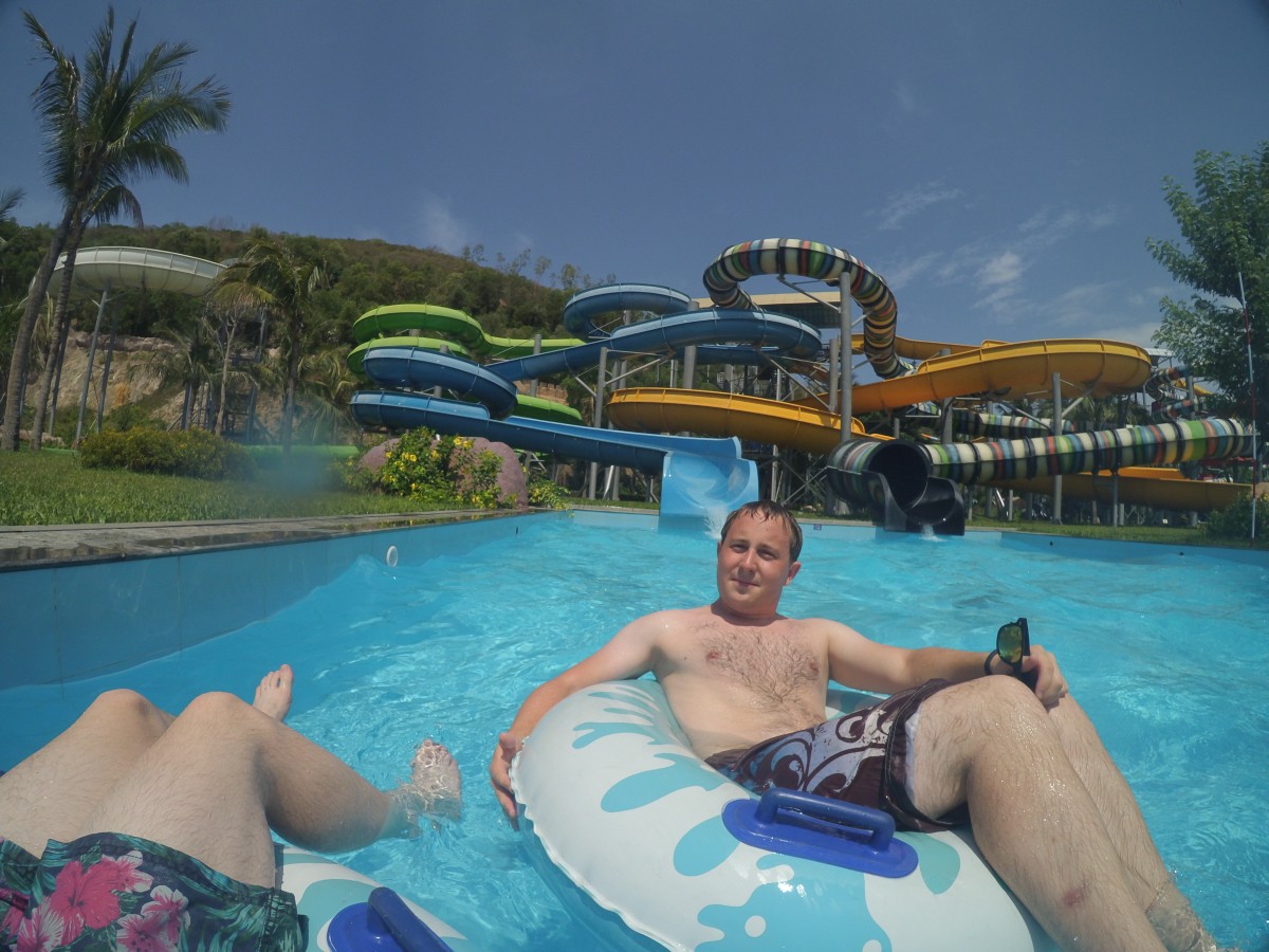 Gestern war der letzte Tag in Hoi An, nach dem wir unsere fertigen Anzüge abgeholt hatten sind wir noch etwas durch die Stadt geschlendert um dann Abends mit dem Nachtbus nach Nha Trang zu fahren. Heute sind wir dann nach einer super holprigen Fahrt gegen 6:30 angekommen, da der Check-in aber erst ab 11:00 im Hostel möglich war haben wir unsere Badehosen eingepackt und sind mit dem Bus zum Vinpearlland Vergnügungspark gefahren der unter anderem einen Wasserpark beinhaltet. Der Eintritt ist für Vietnam mit 20€ relativ hoch dafür sind aber alle Fahrgeschäfte und die Überfahrt mit Fähre/Seilbahn im Preis enthalten. Nach dem Park ging es dann zurück nach Nha Trang, wo uns das erste Mal aufgefallen ist das es von Russen nur so wimmelt. Daher hat auch ein Großteil der Bars und Geschäfte kyrillische Leuchtreklame und Karten ausliegen.