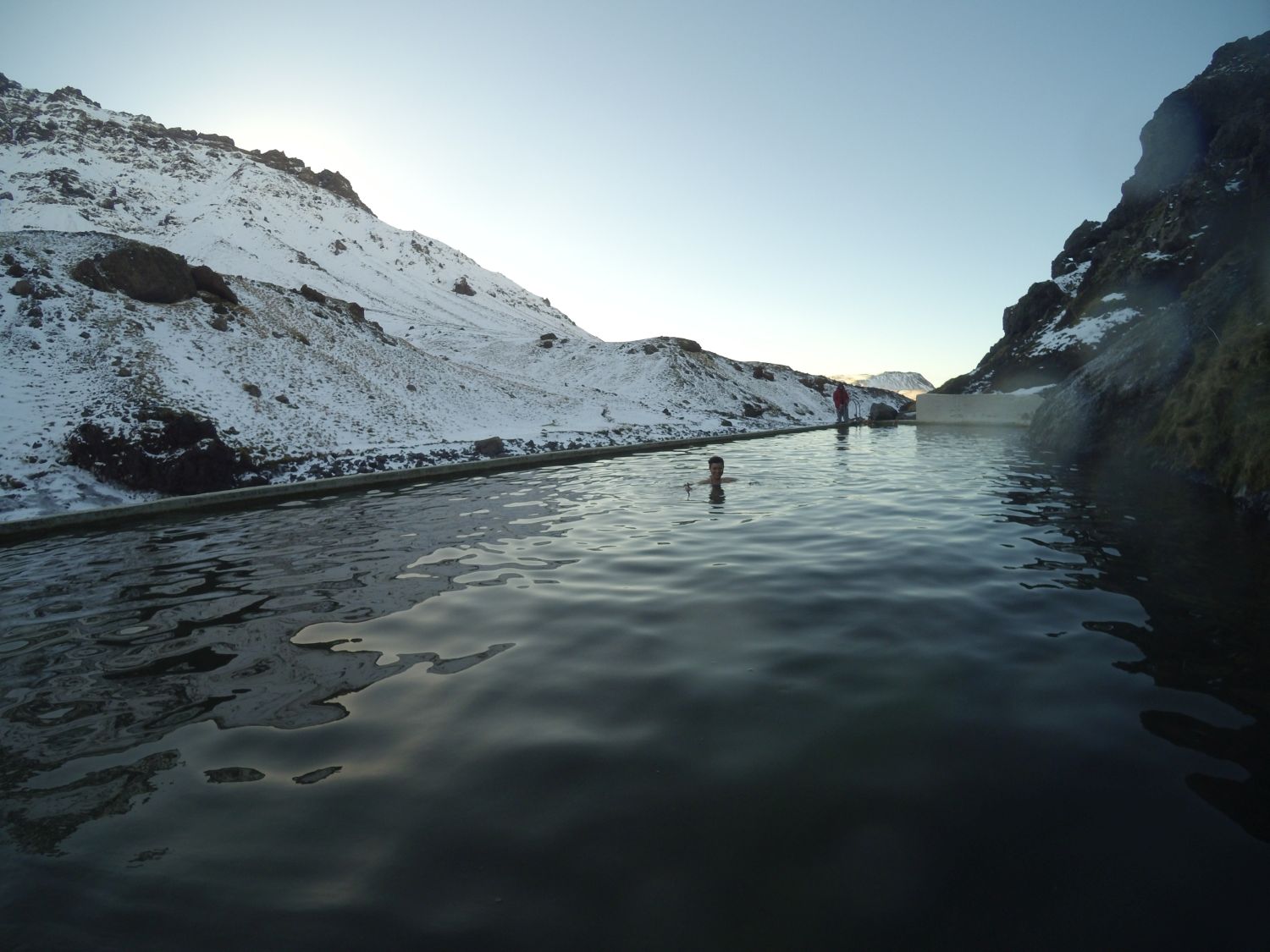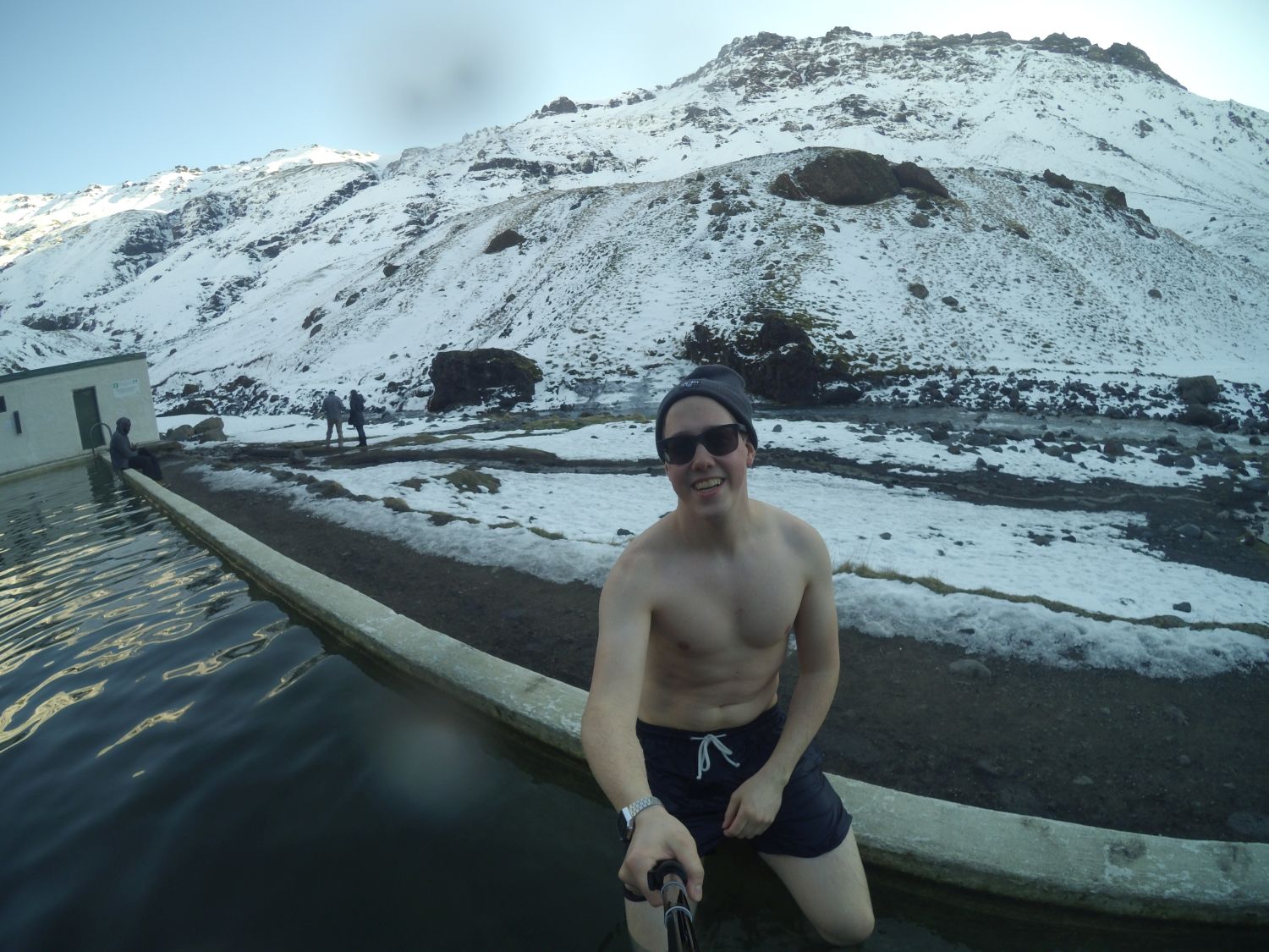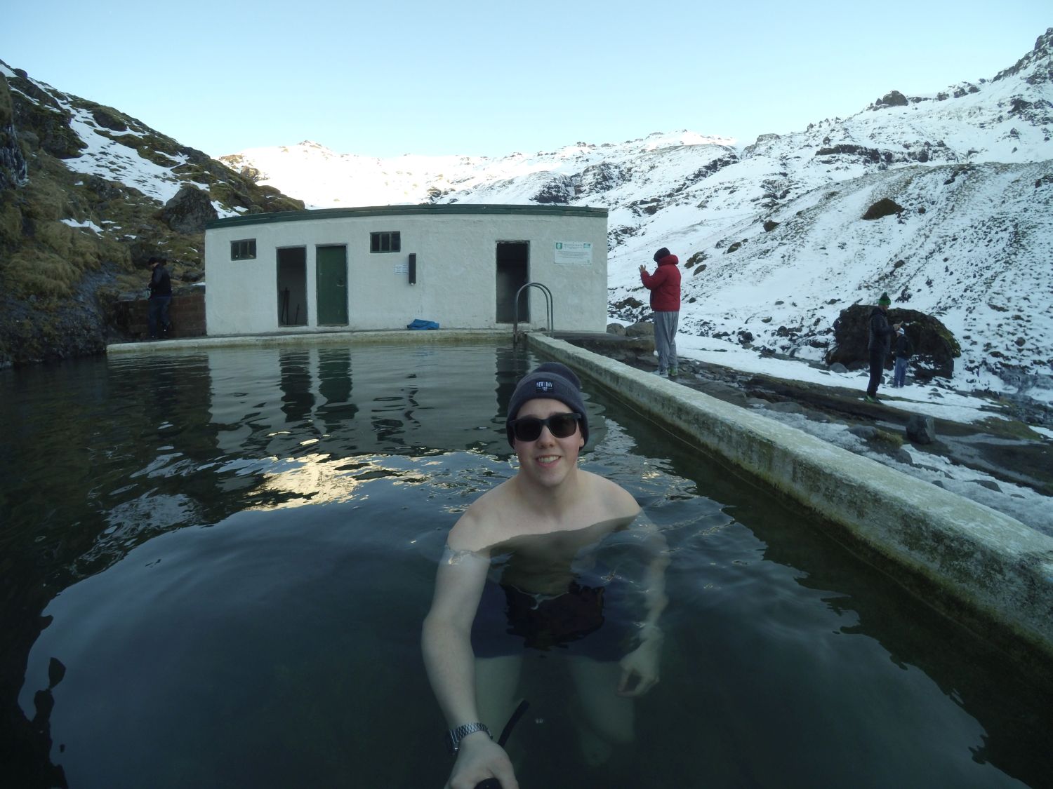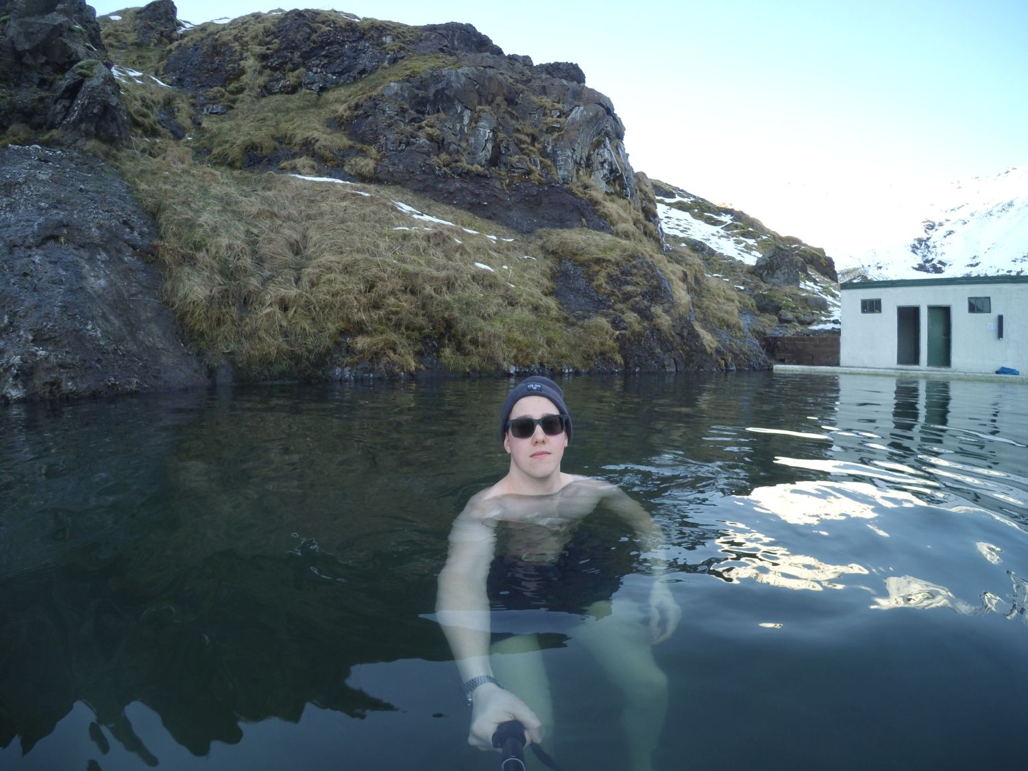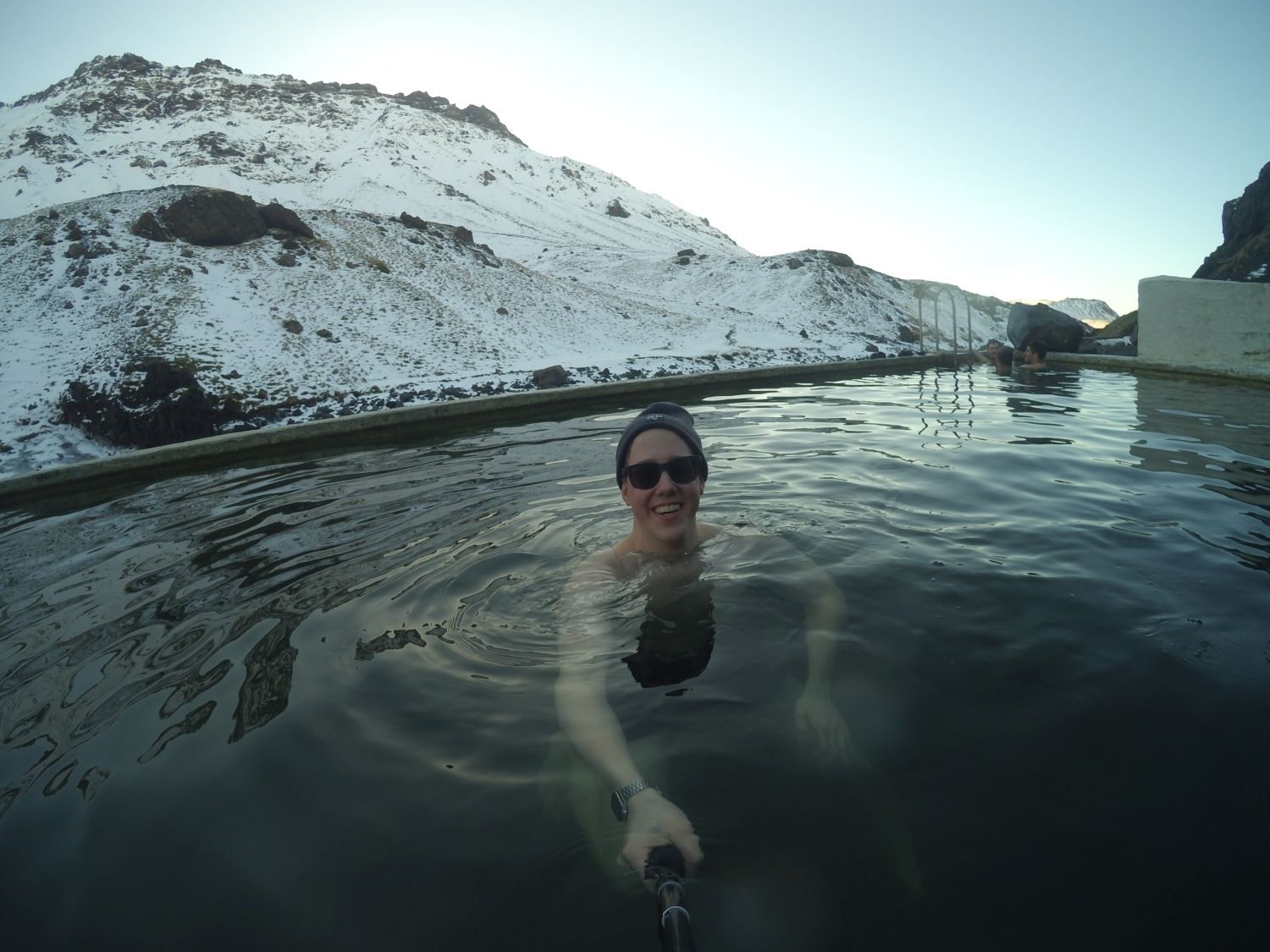 Heute Stand die nächste Etappe in Richtung Selfoss an. Die Ringstraße führte uns heute am Wasserfall Skógafoss vorbei. Im Anschluss besuchten wir einen versteckten Pool, der von einer heißen Quelle gespeist wird und vom Erbauer direkt an die Bergwand gebaut wurde, um eine Außenwand einzusparen. Der Weg dort hin war doch recht abenteuerlich, da der Pool wirklich mitten im Nirgendwo gelegen ist und ein reißender Bergbach überwunden werden muss. Leider war die provisorische Holzbrücke über den Bach halb davon gespült worden, was die Überquerung zu einem Drahtseilakt machte. Der beschwerliche Weg schreckt glücklicherweise die meisten Touristen ab, sodass wir den Pool fast für uns allein hatten. Das Immunsystem wurde nach dem Baden im lauwarmen Wasser durch das Anziehen bei Eiseskälte noch mal gestärkt bevor es weiter zum nächsten Wasserfall und anschließend nach Selfoss ins Hostel ging.