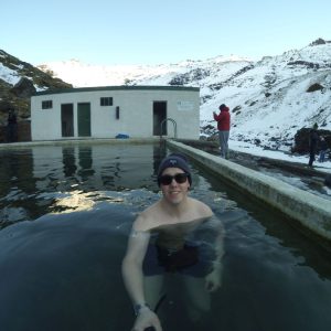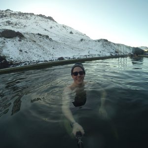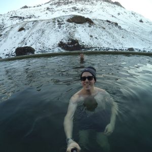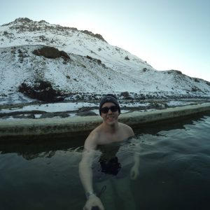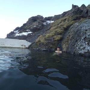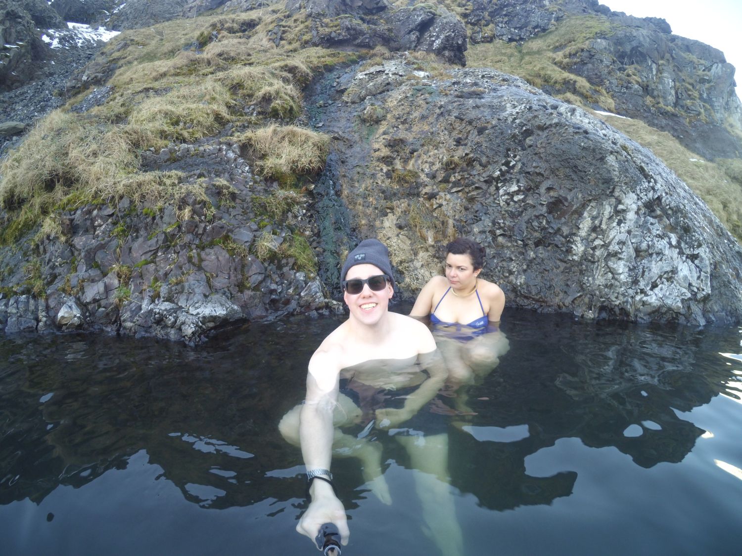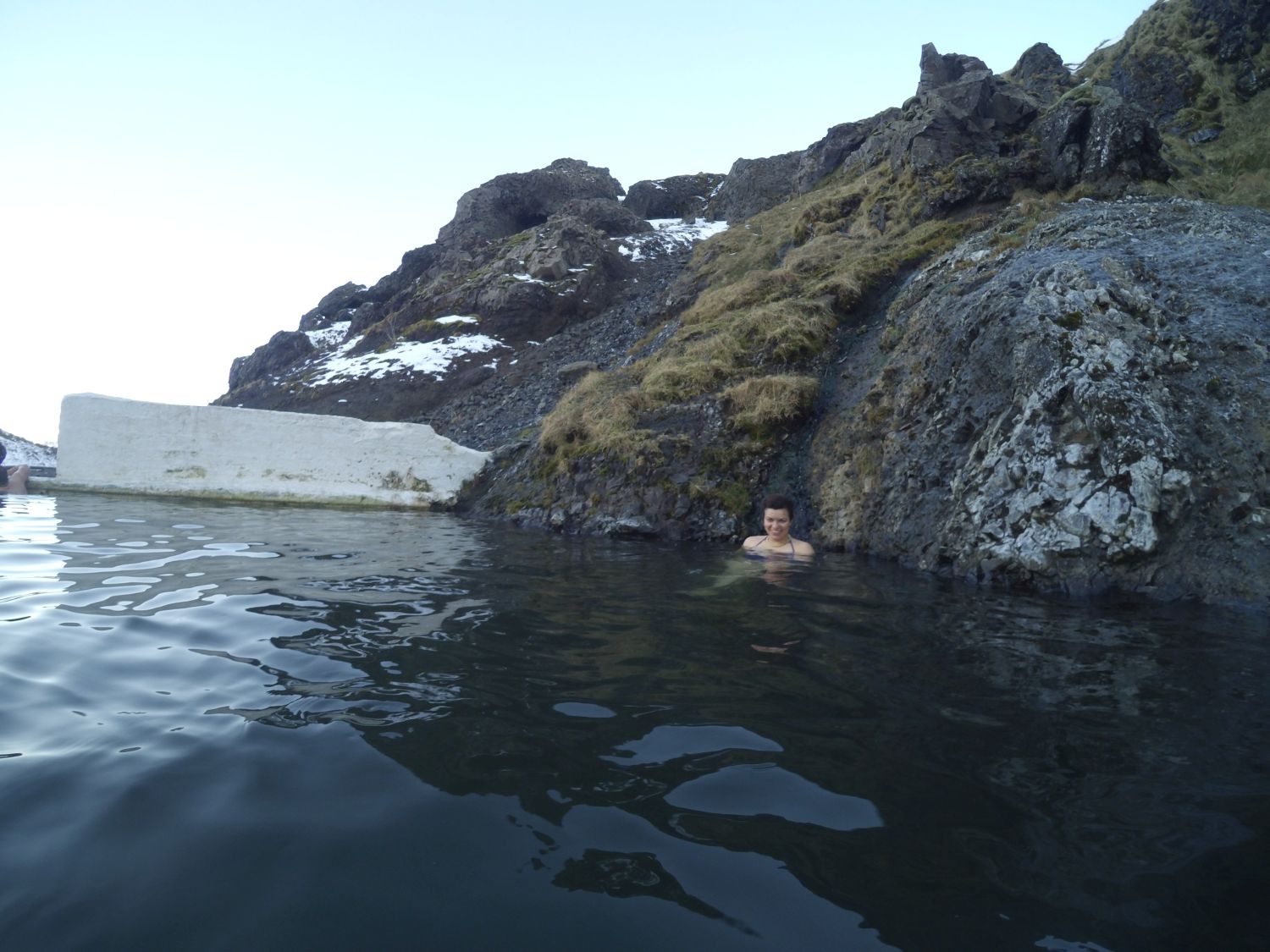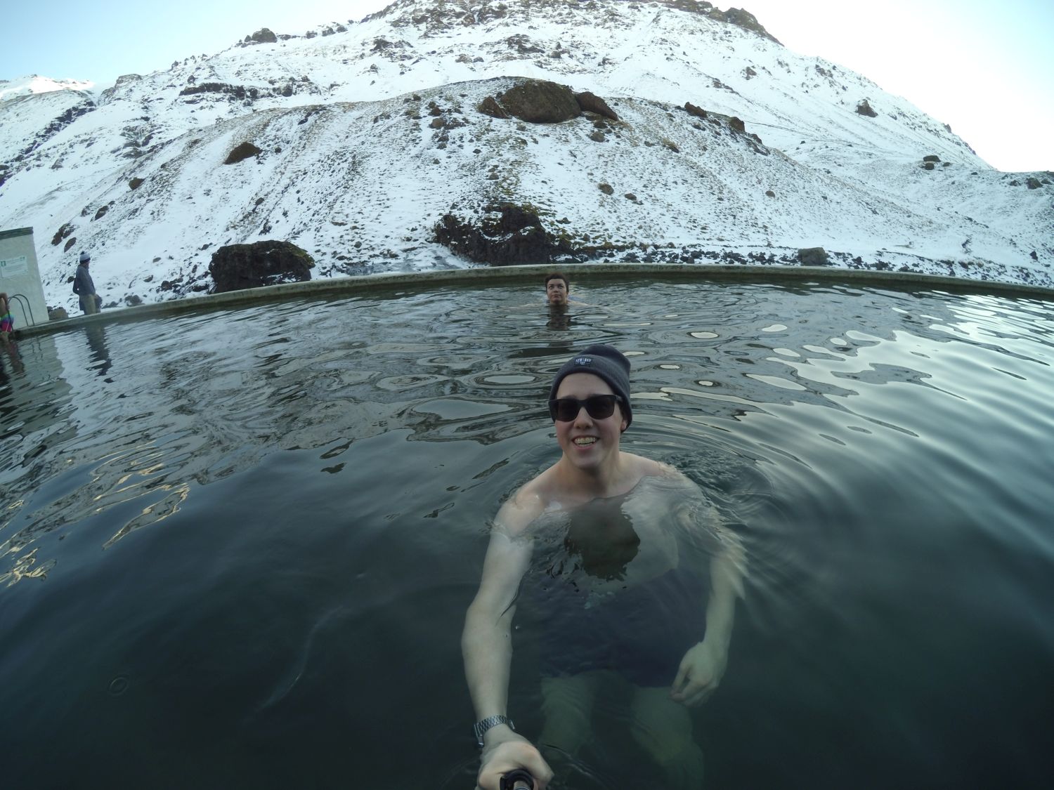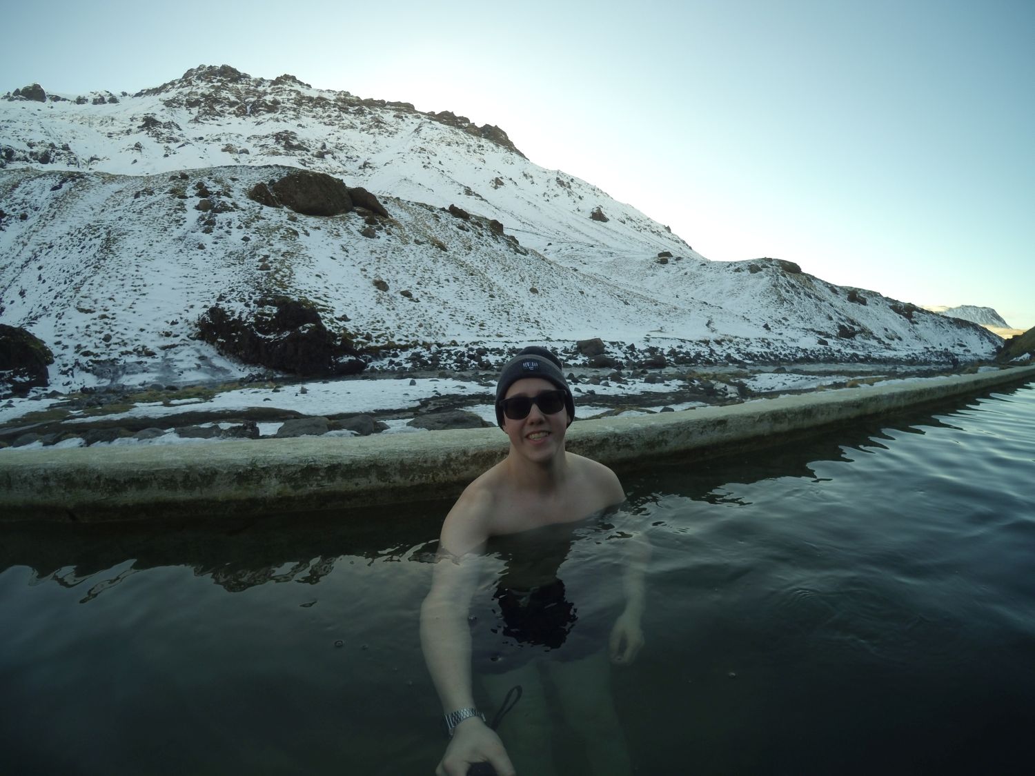 Heute Stand die nächste Etappe in Richtung Selfoss an. Die Ringstraße führte uns heute am Wasserfall Skógafoss vorbei. Im Anschluss besuchten wir einen versteckten Pool, der von einer heißen Quelle gespeist wird und vom Erbauer direkt an die Bergwand gebaut wurde, um eine Außenwand einzusparen. Der Weg dort hin war doch recht abenteuerlich, da der Pool wirklich mitten im Nirgendwo gelegen ist und ein reißender Bergbach überwunden werden muss. Leider war die provisorische Holzbrücke über den Bach halb davon gespült worden, was die Überquerung zu einem Drahtseilakt machte. Der beschwerliche Weg schreckt glücklicherweise die meisten Touristen ab, sodass wir den Pool fast für uns allein hatten. Das Immunsystem wurde nach dem Baden im lauwarmen Wasser durch das Anziehen bei Eiseskälte noch mal gestärkt bevor es weiter zum nächsten Wasserfall und anschließend nach Selfoss ins Hostel ging.