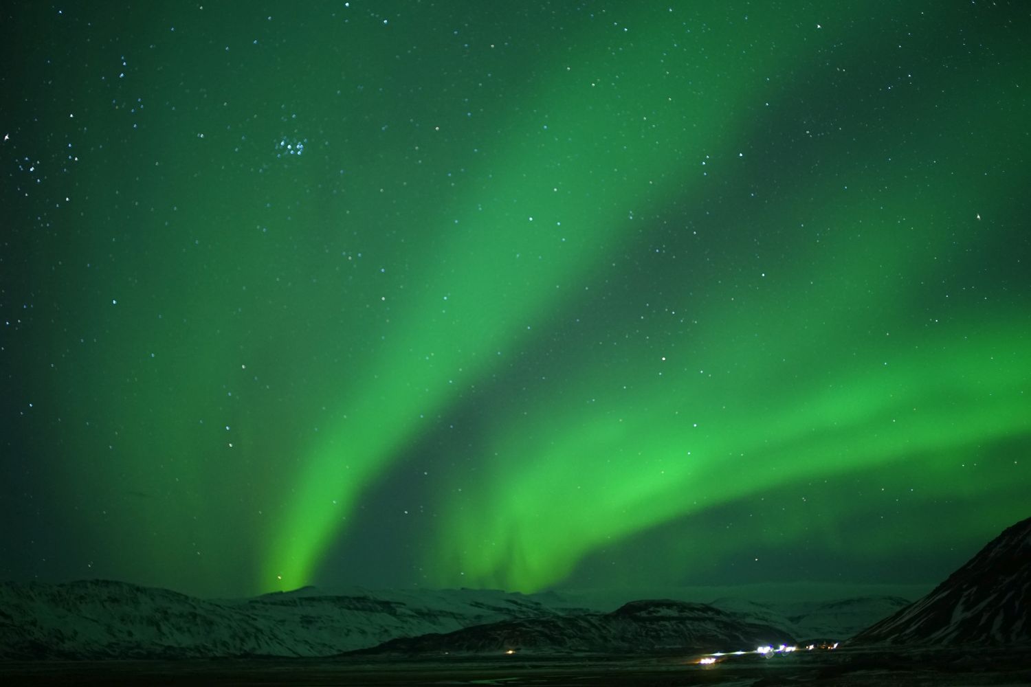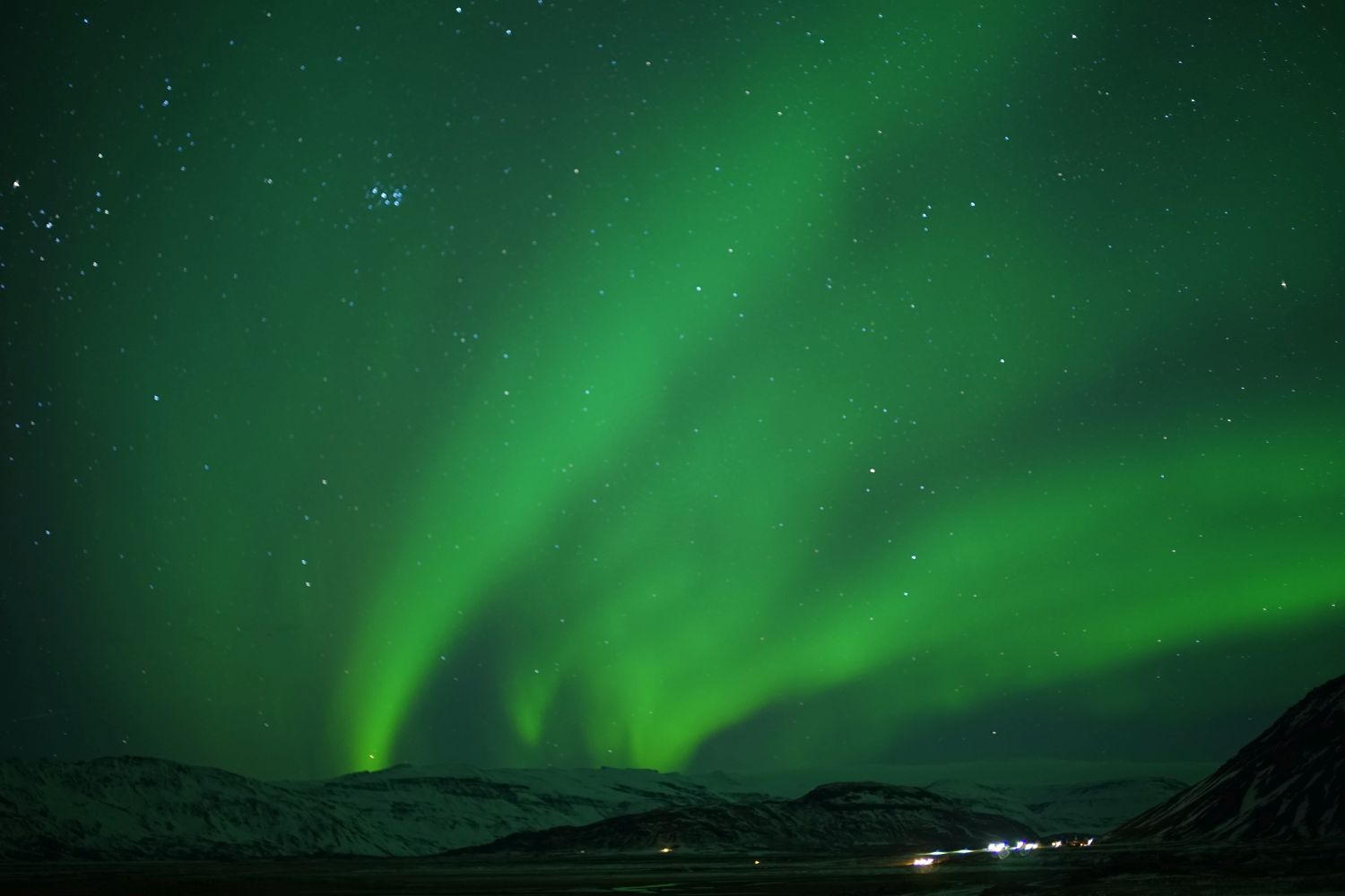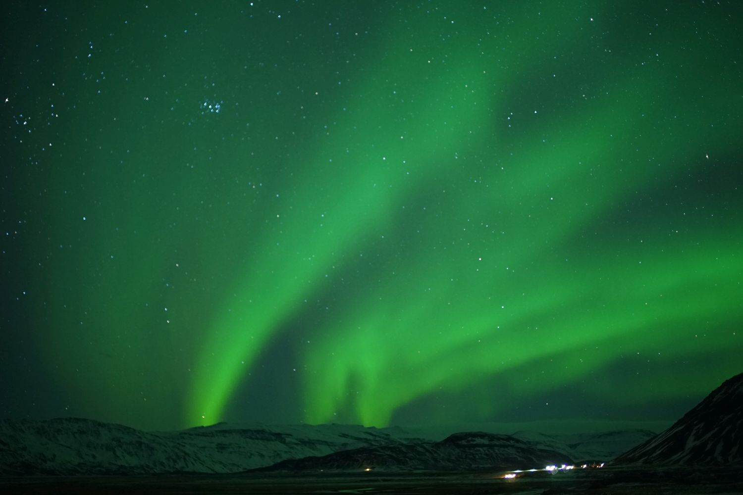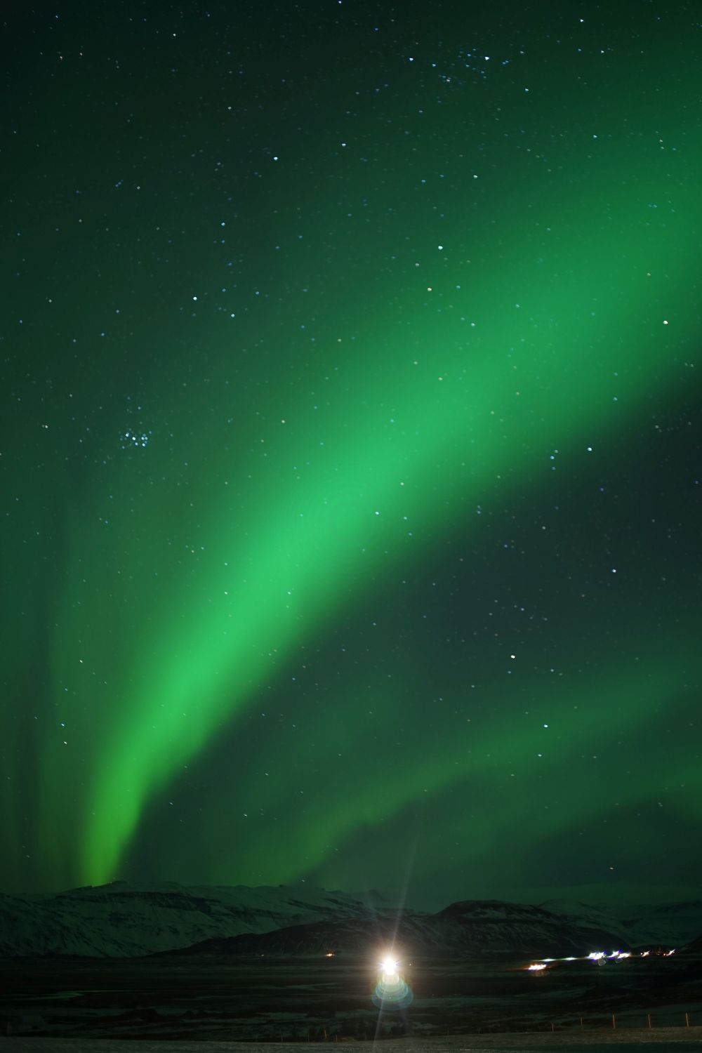 Nach einem morgendlichen Spaziergang durch den Ort ging es zurück über den Bergpass in den Süden von Island. Nach anfänglich durchwachsenem Wetter klarte es schnell auf und wir hatten herrlichen Sonnenschein. Genächtigt wurde in einem kleinen Gästehaus etwa 15 Minuten von Höfn entfernt. Da die Aurora-Vorhersage besonders viel versprechen war, legten wir uns am Küchenfenster auf die Lauer. Gegen halb 12 war es dann endlich so weit und wir konnten die ersten Schleier der Nordlichter am Himmel erkennen. Also schnell Stativ und Kamera zusammengebaut und raus auf das angrenzende Feld. Nach etwa einer drei viertel Stunde war das Spektakel am Himmel zu Ende und wir konnten durchfroren aber glücklich wieder zurück in die warme Unterkunft.