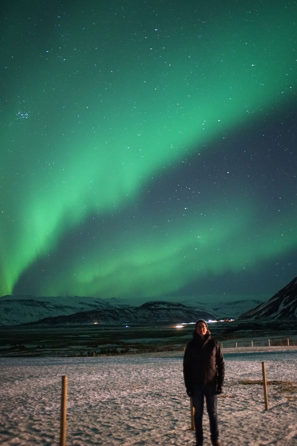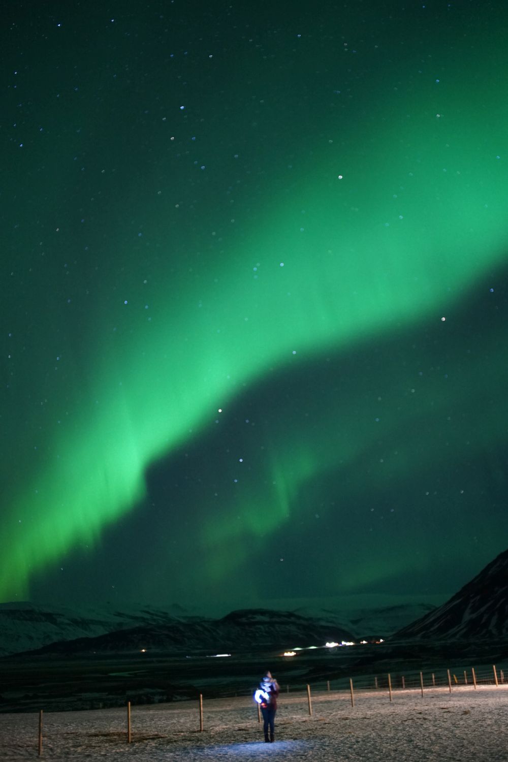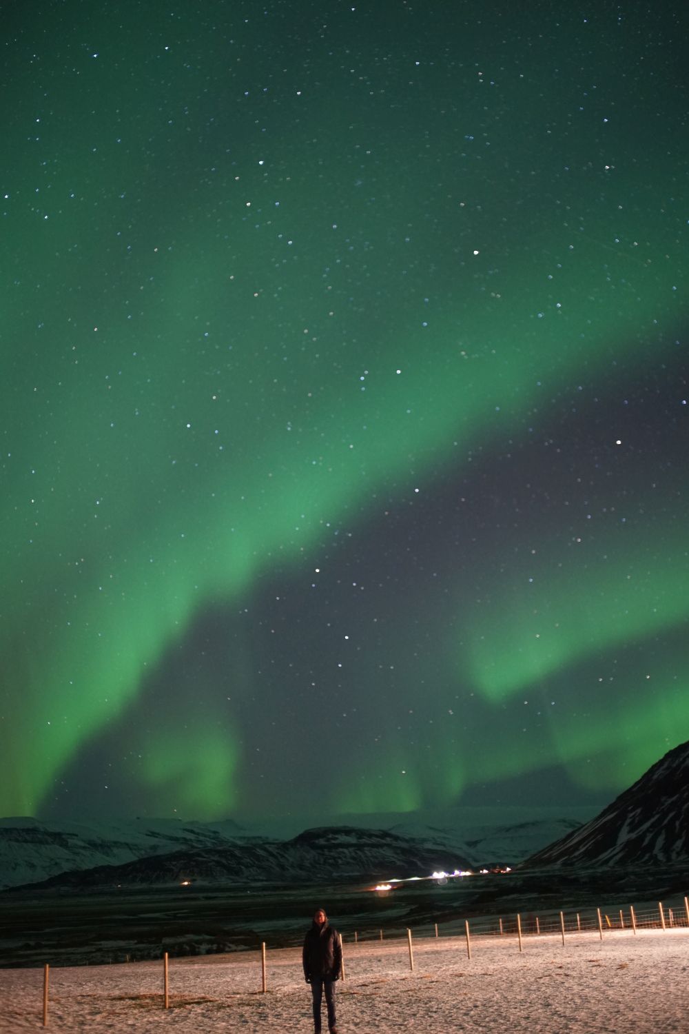 Nach einem morgendlichen Spaziergang durch den Ort ging es zurück über den Bergpass in den Süden von Island. Nach anfänglich durchwachsenem Wetter klarte es schnell auf und wir hatten herrlichen Sonnenschein. Genächtigt wurde in einem kleinen Gästehaus etwa 15 Minuten von Höfn entfernt. Da die Aurora-Vorhersage besonders viel versprechen war, legten wir uns am Küchenfenster auf die Lauer. Gegen halb 12 war es dann endlich so weit und wir konnten die ersten Schleier der Nordlichter am Himmel erkennen. Also schnell Stativ und Kamera zusammengebaut und raus auf das angrenzende Feld. Nach etwa einer drei viertel Stunde war das Spektakel am Himmel zu Ende und wir konnten durchfroren aber glücklich wieder zurück in die warme Unterkunft.