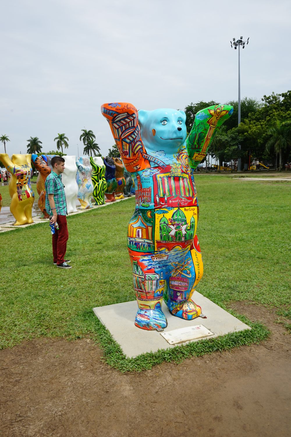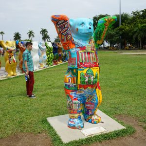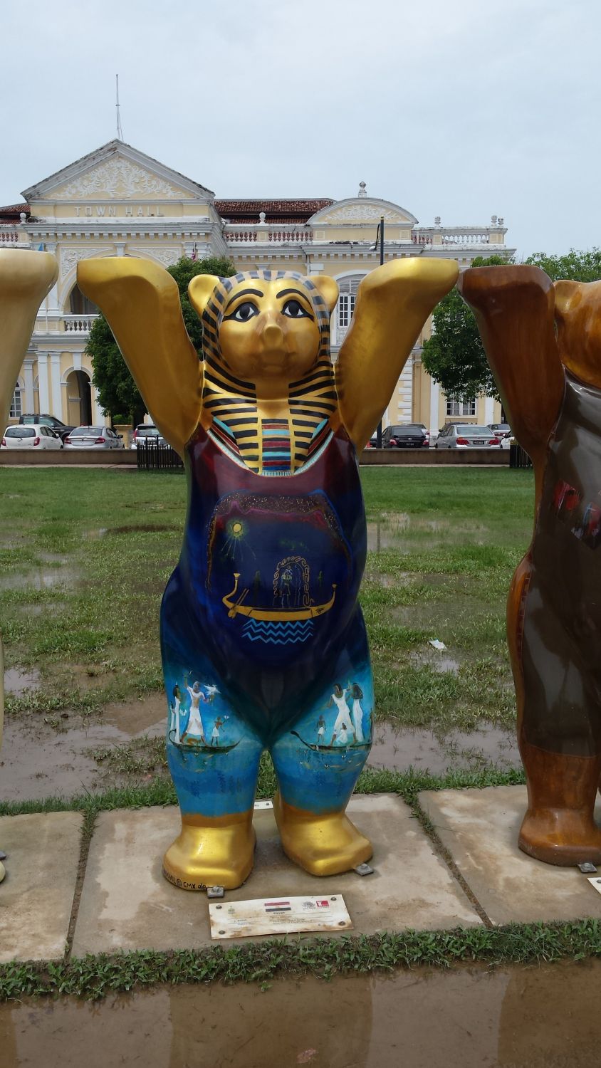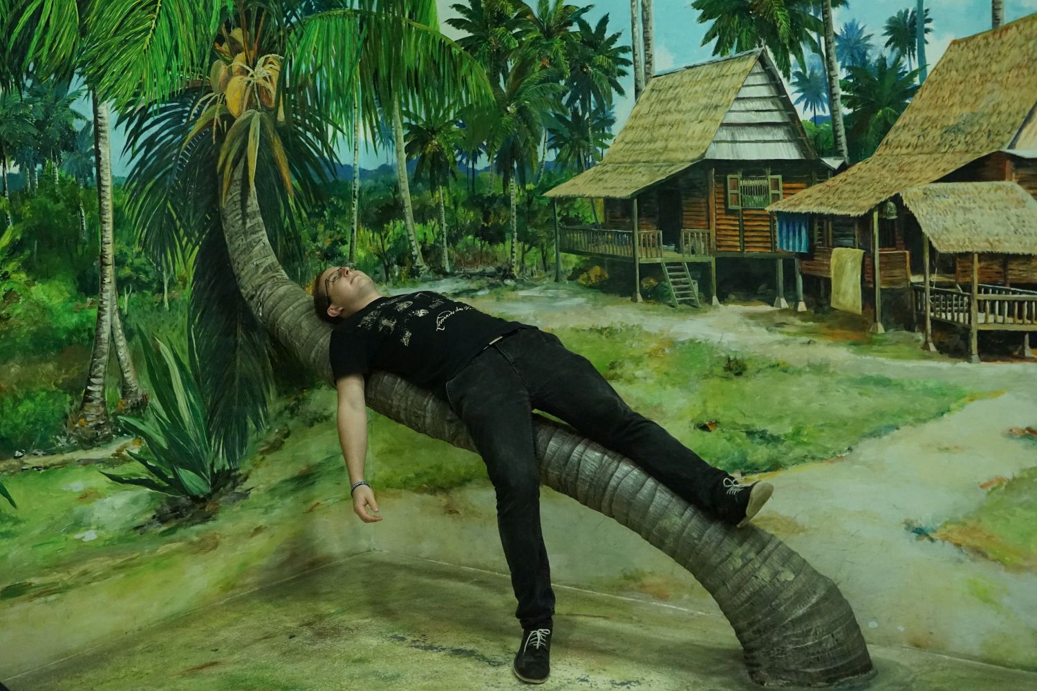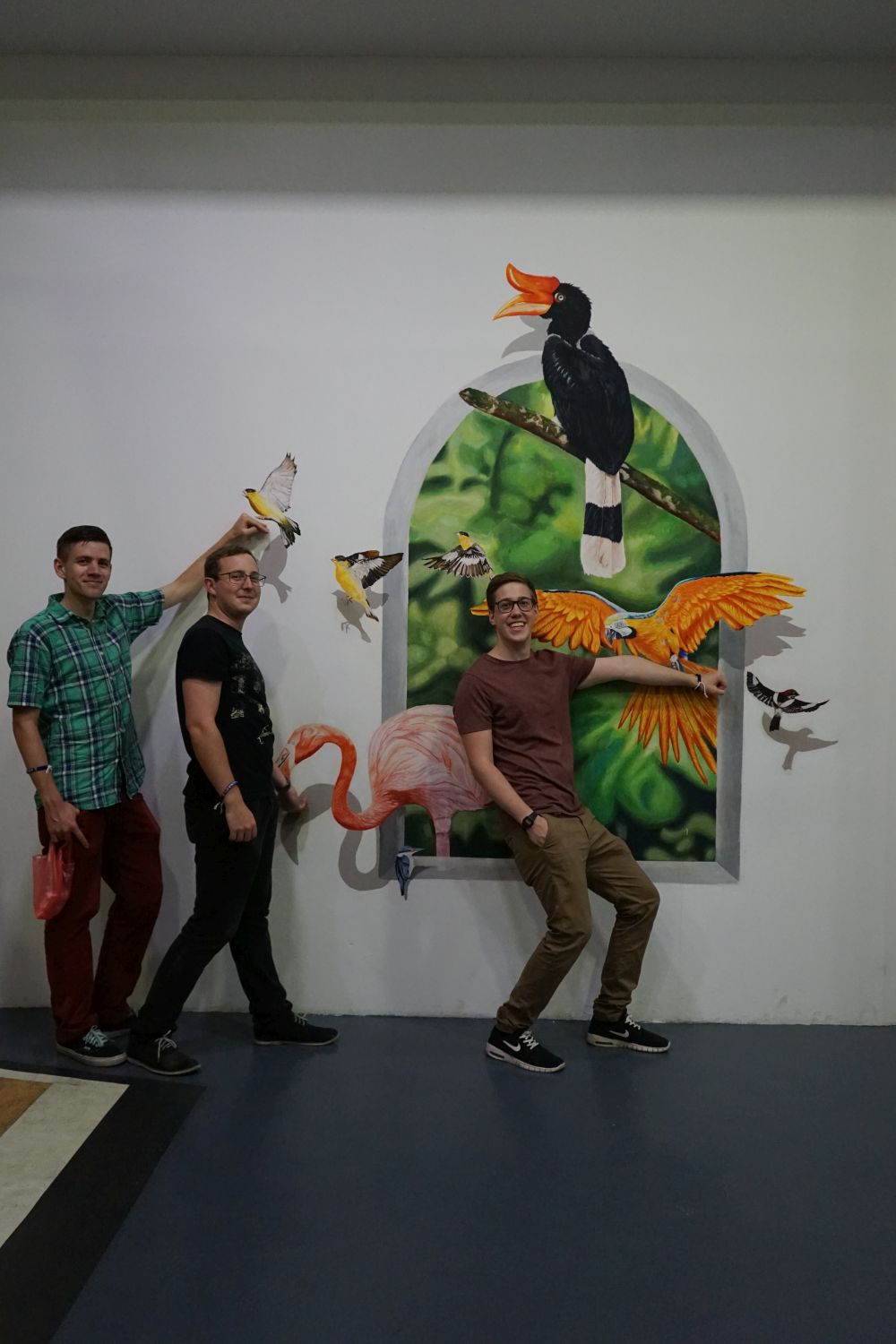 Da es bei unserer gestrigen Ankunft bereits dunkel war sollte heute Penang etwas erkundet werden. Gut 50% der malaysischen Bevölkerung ist dem Islam zugehörig. Dies viel uns bereits zum Sonnenaufgang auf als der erste Muezzin-Ruf ertönte und wir alle aus unseren Betten fielen. Um gegen diese Frühe Ruhestörung Beschwerde einzulegen ging es als erstes in die Moschee auf unserer Straße. Nach einer kurzen Führung sowie einer Gebetsdemonstration verließen wir das Gotteshaus mit einem Paket an Infoflyern für Ungläubige. Durch das indische Viertel führte unsere Weg in Richtung Rathaus vor dem eine Reihe von Berliner-Bären aufgestellt waren. Wir nahmen zu nächst an das es sich hierbei nur um eine zufällige Ähnlichkeit handelte. Es stellte sich dann aber schnell heraus das es hierbei wirklich um eine Aktion eines Berliner Kollektivs handelte und das die einzelnen Bären von den Botschaften der deutschen Hauptstadt gestiftete wurden und jeweils ein Land repräsentieren. Um der heißen Mittagssonne zu entgehen besuchten wir das 3D Trickeye Museum und probierten die ein oder andere optische Täuschung aus. Den kulturellen Pflichtteil des Mittags erledigten wir mit einer Besichtigung der Pinang Peranakan Mansion. Um anschließend zum Hafen zumarschieren von wo es in ein bekanntes Streetart-Viertel ging. Danach Stand das Mittagessen auf dem Programm. Danach begaben wir uns zurück ins Hotel wo wir den Rest des Tages am Pool oder faul im Hotelzimmer verbrachten.